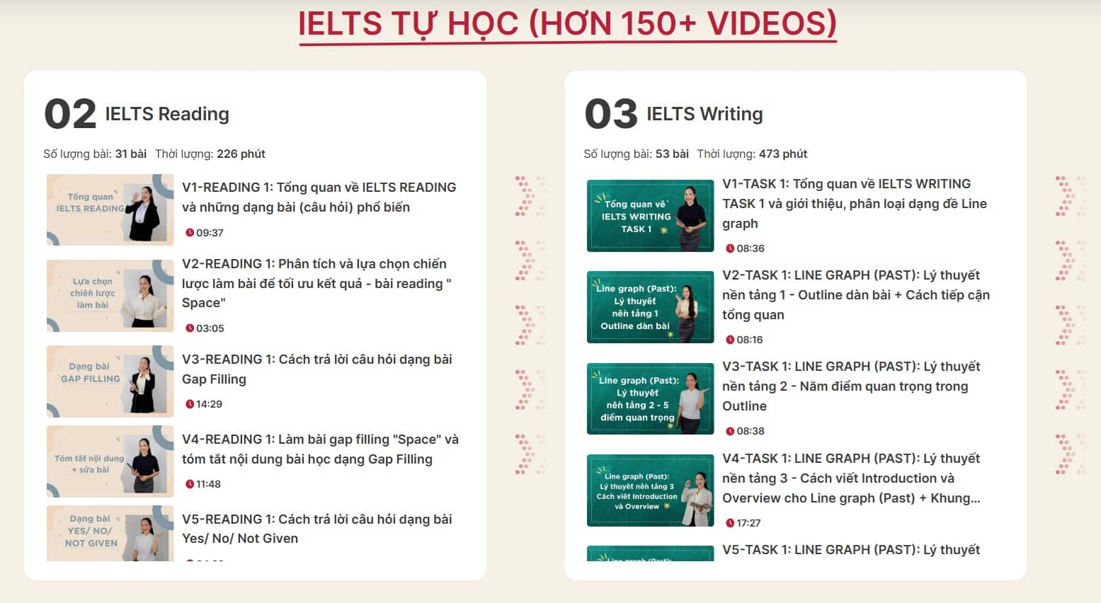 Khóa học được quay dựng xuyên suốt, kèm tài liệu độc quyền chi tiết, video hướng dẫn cách tự ôn luyện 4 kỹ năng thi IELTS và cộng đồng hỗ trợ tận tình sau khóa học.